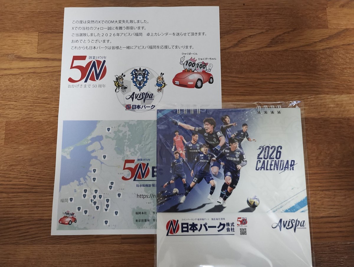 この度ご縁があり、日本パーク株式会社様より2026年度卓上カレンダーに当選しました🥳 本当に嬉しいです!送っていただきありがとうございました! 大事に職場の机に飾っておきます! #アビスパ福岡 #日本パーク株式会社 #うちの自慢のスポンサー pic.x.com/d3vfPy8QrC x.com/nihonpark/stat…