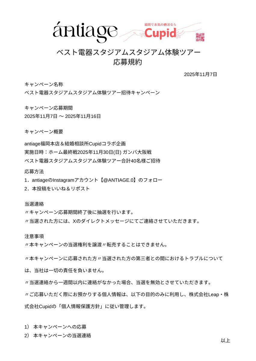 皆様こんばんは スタジアムツアーのご案内です。 応募条件 ①antiageのインスタフォロー ②本投稿のいいね&リポスト 当選者には、antiageコラボ光るアクリルキーホルダーをプレゼント🎁 たくさんの方の思い出に残る30周年ホーム最終戦になりますように #アビスパ福岡 #antiage #Cupid