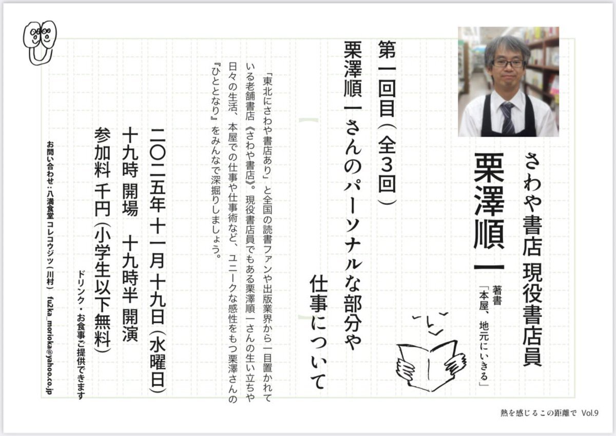 今月のイベント! 熱を感じるこの距離でvol.9 さわや書店の栗澤順一さまをお招きしての開催です! 今回は栗澤さんを深掘りです! 皆様のご来場お待ちしております! #さわや書店 #栗澤順一 #本屋、地元にいきる pic.x.com/j2DRqOwZC5
