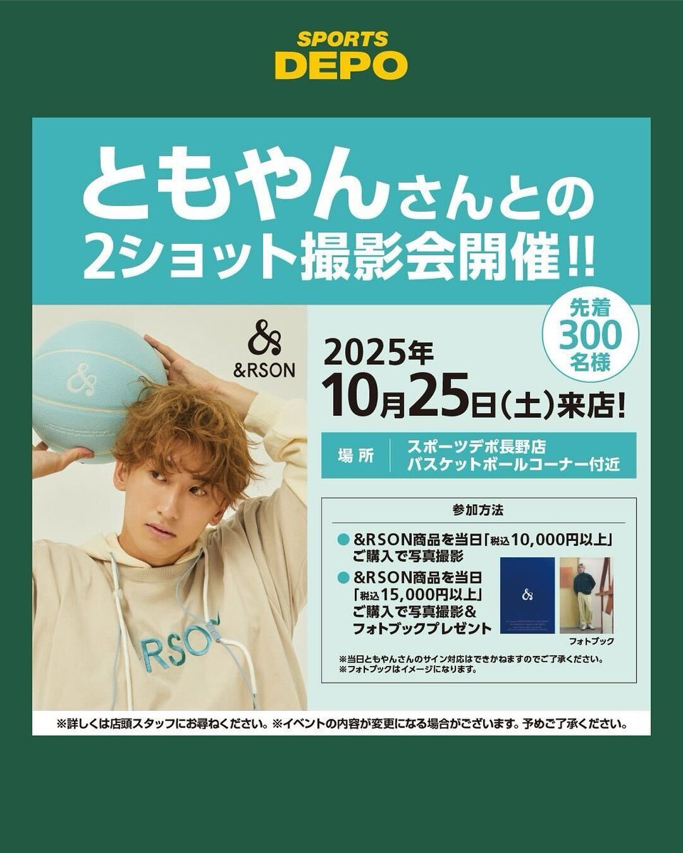 /⋰ ともやんさんに会いに長野へ行こう! 2ショット撮影会開催📸 \⋱ 【開催日】10.25(土) 【場所】スポーツデポ 長野店 【参加方法】 ①¥10,000(税込)以上お買い上げで #ともやん さんとの写真撮影📸 ②¥15,000(税込)以上お買い上げで 写真撮影&ルックブックプレゼント ※なくなり次第終了 pic.x.com/paWACtZfgi
