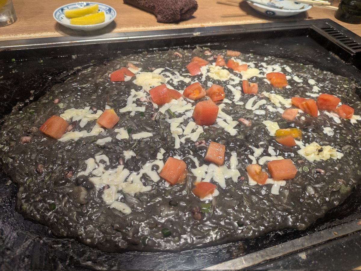 イカ墨もんじゃ チーズトマトレモントッピング 美味しかった #もへじ pic.x.com/BCtGC2OQhm