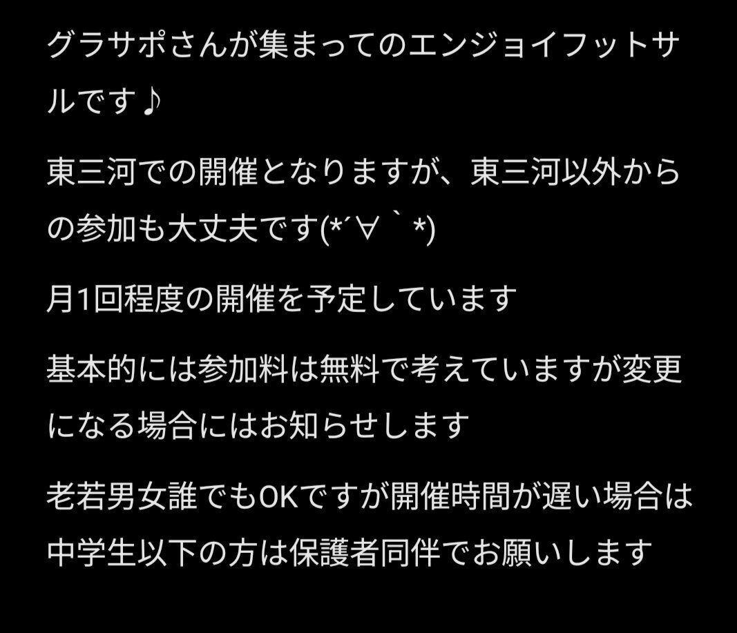 一緒にフットサルやりませんかー メンバーが4人程足りなくて急募です 日時:11/15(土)15時〜17時 場所:フットサルアリーナ豊橋 参加費:無料 グラサポさんが集まってのエンジョイフットサルです 人数が集らない場合は中止になります 開催可否の関係で11/5までに参加希望の方はリプorDMお願いします