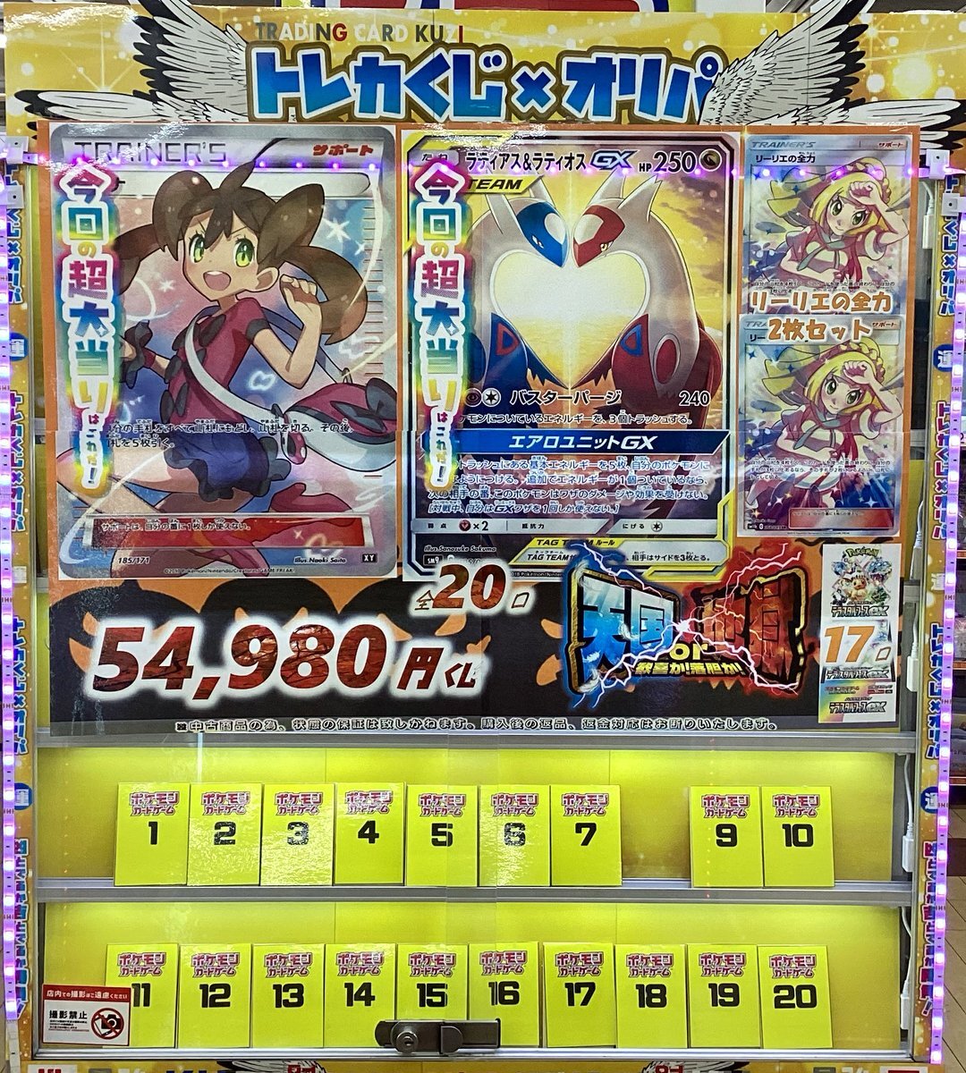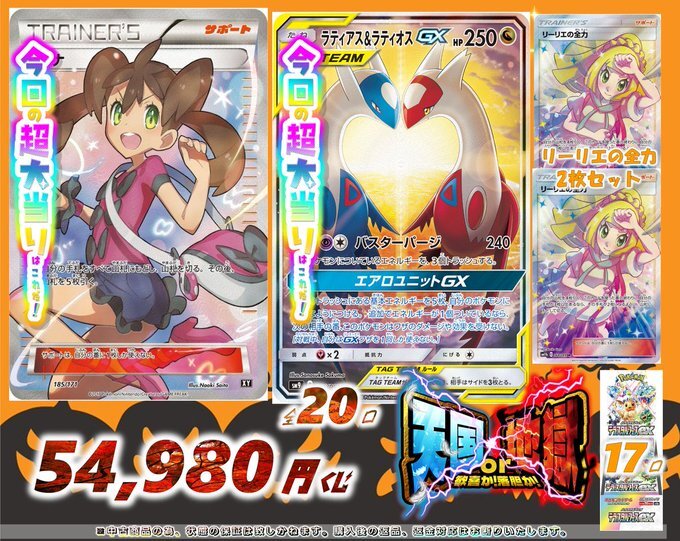 ポケカオリパ情報📢 5⃣4⃣9⃣8⃣0⃣円 全2⃣0⃣口で展開中😆 ▷▷残り1⃣9⃣口 pbs.twimg.com/media/G3wBgrlX… 超大当たりには #サナ #ラティアスアンドラティオスGX などが入ってます‼️ ハズレは #テラスタルフェスex です😾 皆様の挑戦お待ちしております🧸 #トレカチャンピオン大徳寺店 pic.x.com/Je5XJ9zFjk