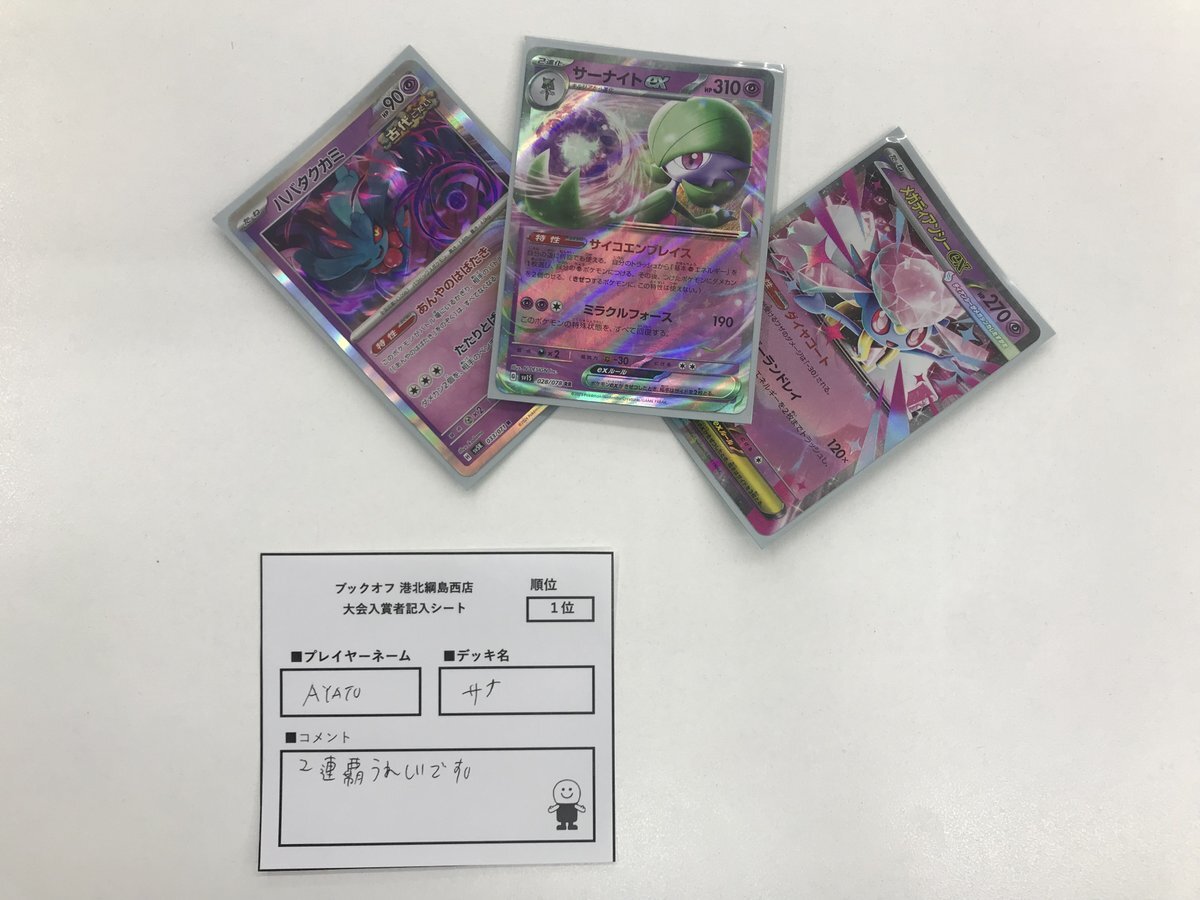 本日の #ポケカ #ジムバトル の結果報告です!! ▶️参加者 17人 ▶️優勝者 AYATOさん ▶️デッキ #サナ おめでとうございます!!😆 次の大会のご参加、お待ちしております‼️ #ブックオフ港北綱島西店 pic.x.com/uqPFqJhm0H