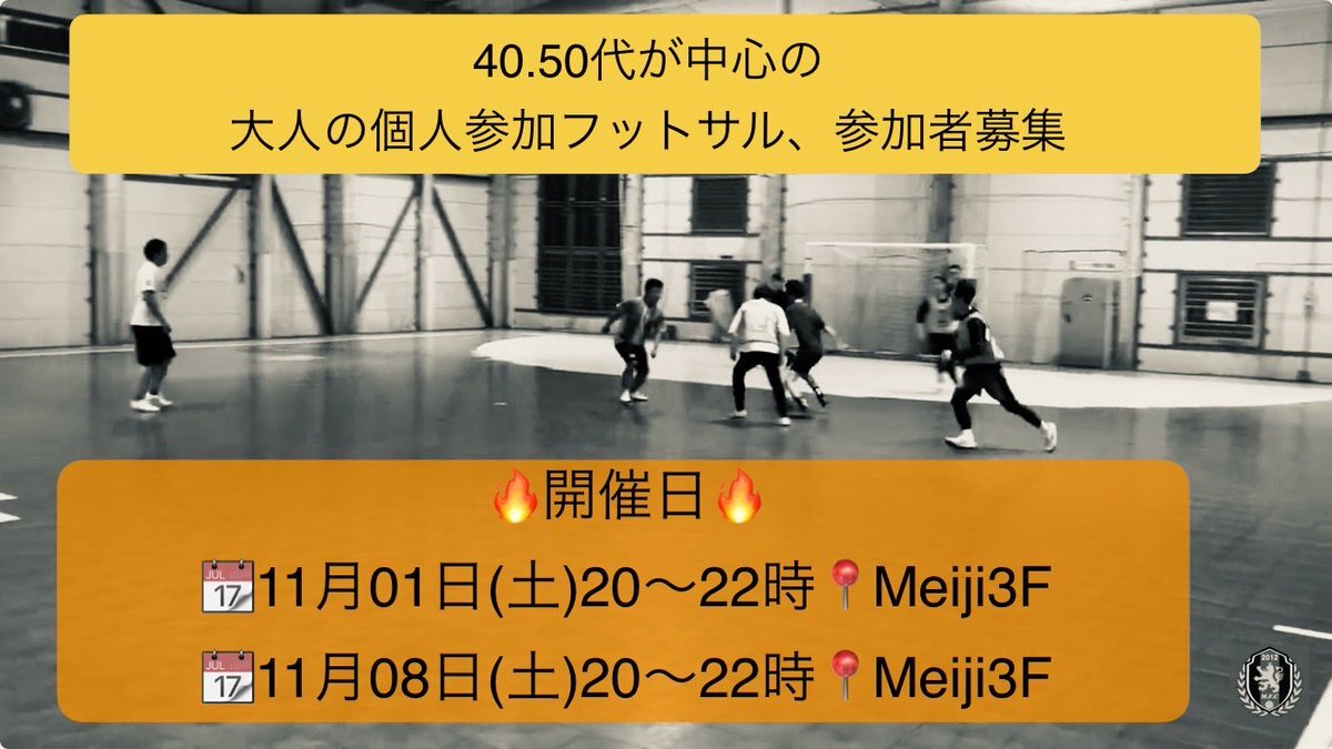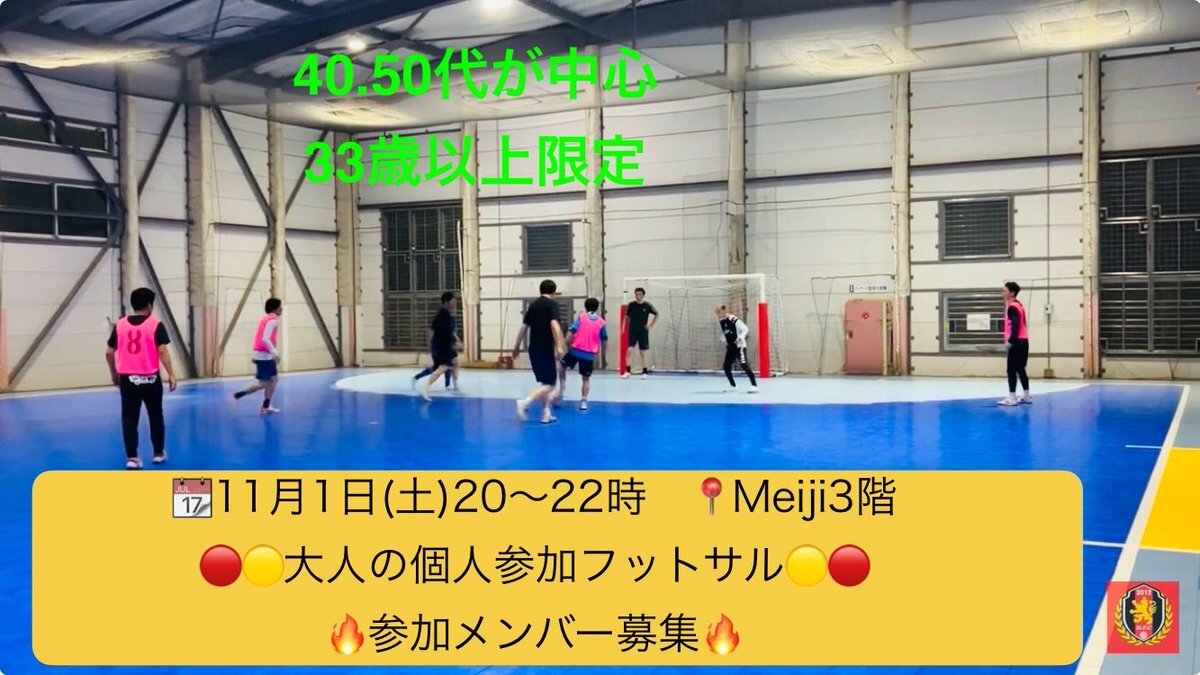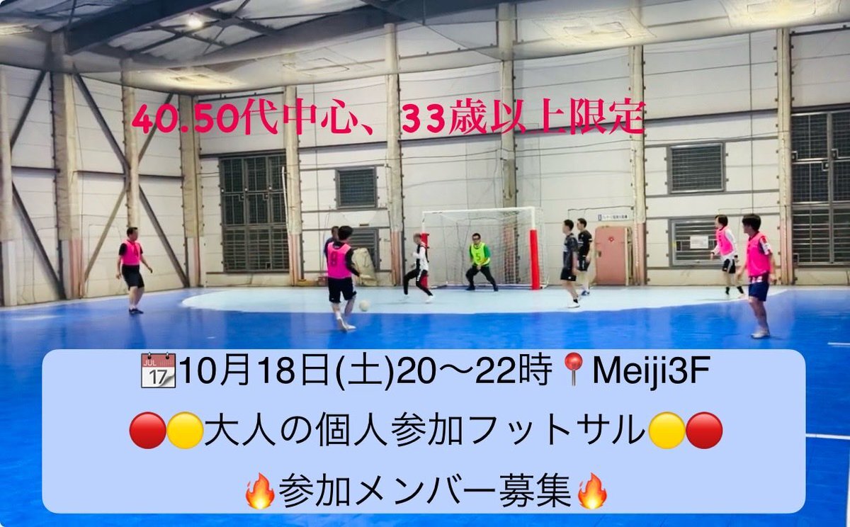 10/18は満員です 圧倒的感謝しかないです🥹 11月も是非🤗 【参加者情報】 第306回 10月18日(土) 20〜22時 残り0名🈵 10月25日(土)は施設閉館の為 お休みさせて頂きます🙇♂️ 第307回 11月01日(土) 20〜22時 残り16名🈳 #フットサル #Meijiフットサル #平均年齢45歳 #個人参加