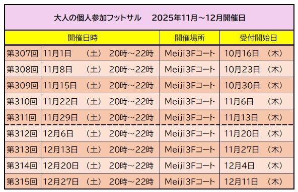 圧倒的早さ😅残りわずかです ※お早めに🤗 【参加者情報】 第309回 11月15日(土) 20〜22時 残り2名🈳 第310回 11月22日(土) 20〜22時 残り14名🈳 第311回 11月29日(土) 20〜22時 11/13より受付 予告:来年は1/3(土)14時開催 #フットサル #Meijiフットサル #平均年齢45歳 #個人参加