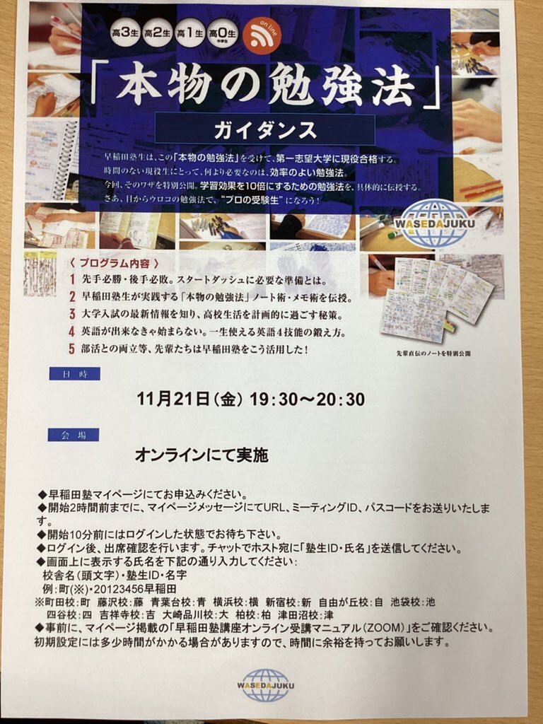 📢「本物の勉強法ガイダンス」のお知らせ📢 11/21(金)19:30〜20:30「本物の勉強法」ガイダンスが行われます 部活動との両立の仕方や英語4技能を効率よく鍛える勉強法など時間のない現役生にとって重要な会になります‼️ ぜひ参加してくださいね♪ #早稲田塾 #横浜校 #勉強法 #現役合格 pic.x.com/5RX3hZLqZY