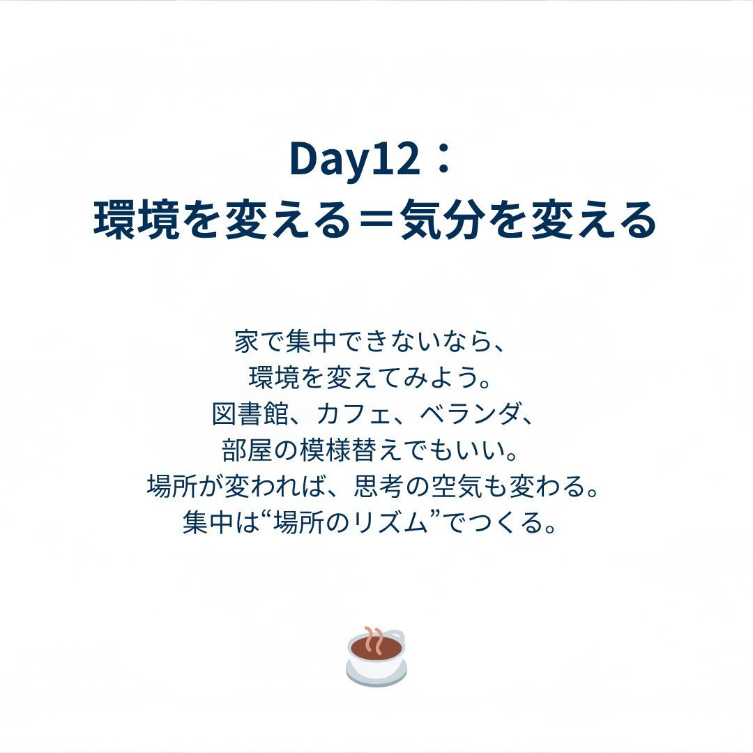 集中できないときは環境を変えてみよう。場所が変われば、思考の空気も変わる。集中力 #環境づくり #勉強法 #教育 pic.x.com/YJzhfpuqGV