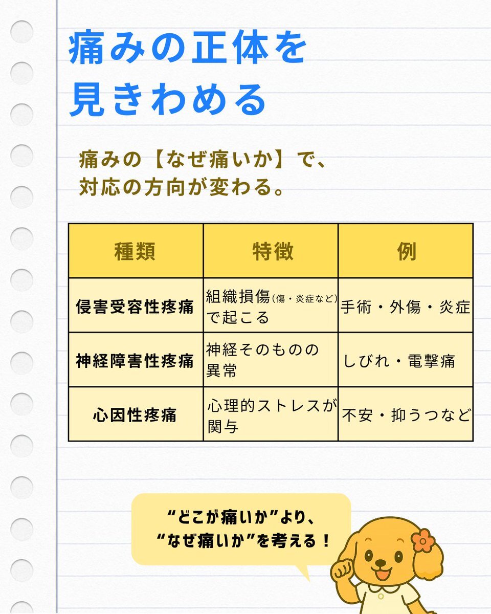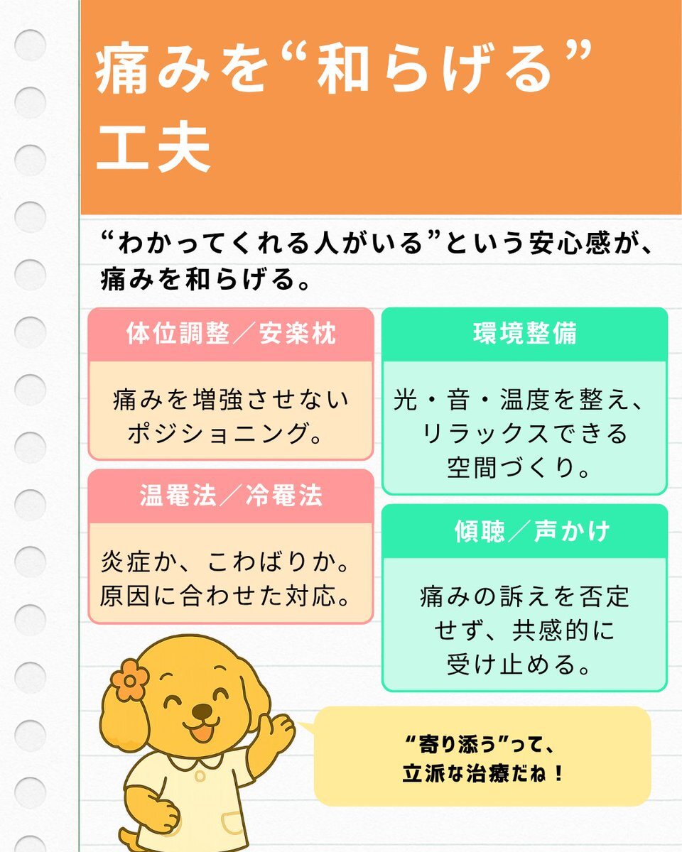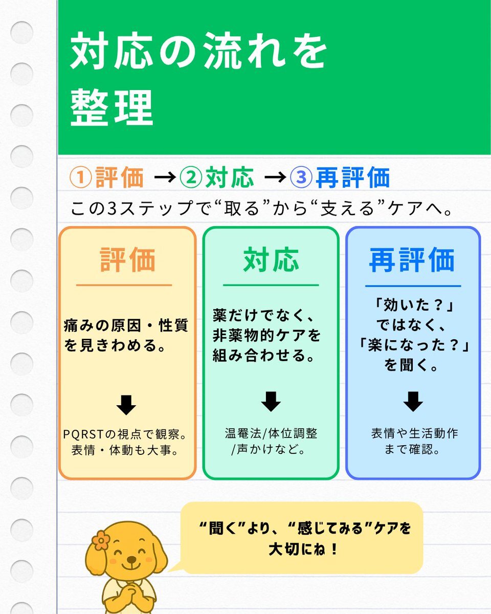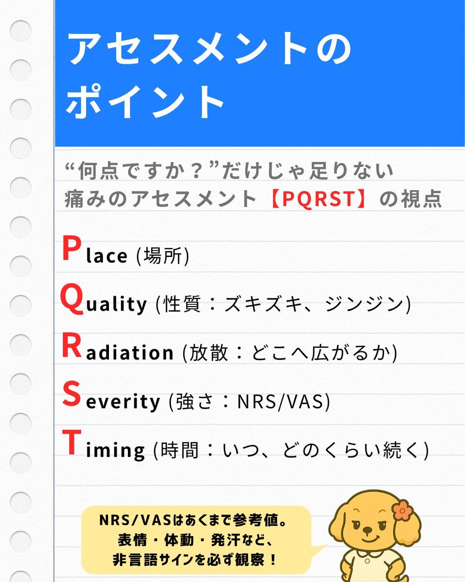 「痛み=数字で測れる」と思っていませんか? NRSが“3”でも、患者さんの表情がつらそうなら、それは“まだ痛い”サイン。 今回のスライドでは、痛みを「取る」だけでなく「支える」ための看護視点をまとめました。 #看護 #疼痛管理 #アセスメント #痛みケア #新人看護師 #医療介護 pic.x.com/rwnu8PNZIJ