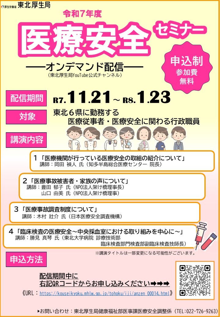 \医療安全セミナー 配信開始/ 今年も医療安全に関するセミナーを動画配信にて行います。 たくさんのご参加をお待ちしております! ■お申込 kouseikyoku.mhlw.go.jp/tohoku/iji/anz… ■配信期間 2025.11.21~2026.1.23 お申込いただくと全4講座の視聴用URLが届きます。 #医療安全 #セミナー pic.x.com/PEGqFZ3Cui