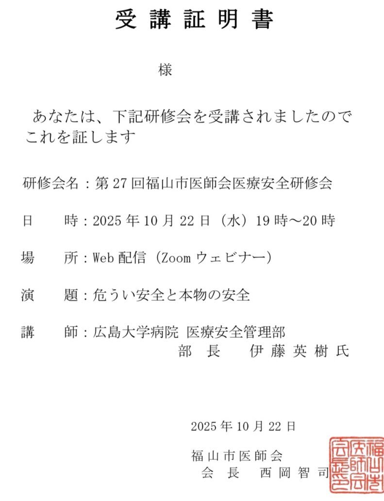 先日夜に #福山市医師会医療安全研修会 をwebで視聴しました。 今回のテーマは”危うい安全と本物の安全”でした。 講師の広島大学病院 伊藤先生ありがとうございました。 #医療安全 #永原内科クリニック pic.x.com/ictAJ0Rdmh