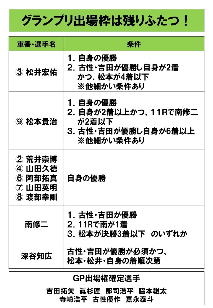 ☆気になるKEIRINグランプリ出場争いは👀⁉ #松本貴治 は2着で出場、3着~6着で相手待ち #松井宏佑 は2着以内が絶対条件 #南修二 は優勝者と松本の結果次第 #深谷知広 は優勝者と松本・松井の結果次第 どうなる!? 決勝戦 まもなく発走です🔥 x.com/minnano_keirin…