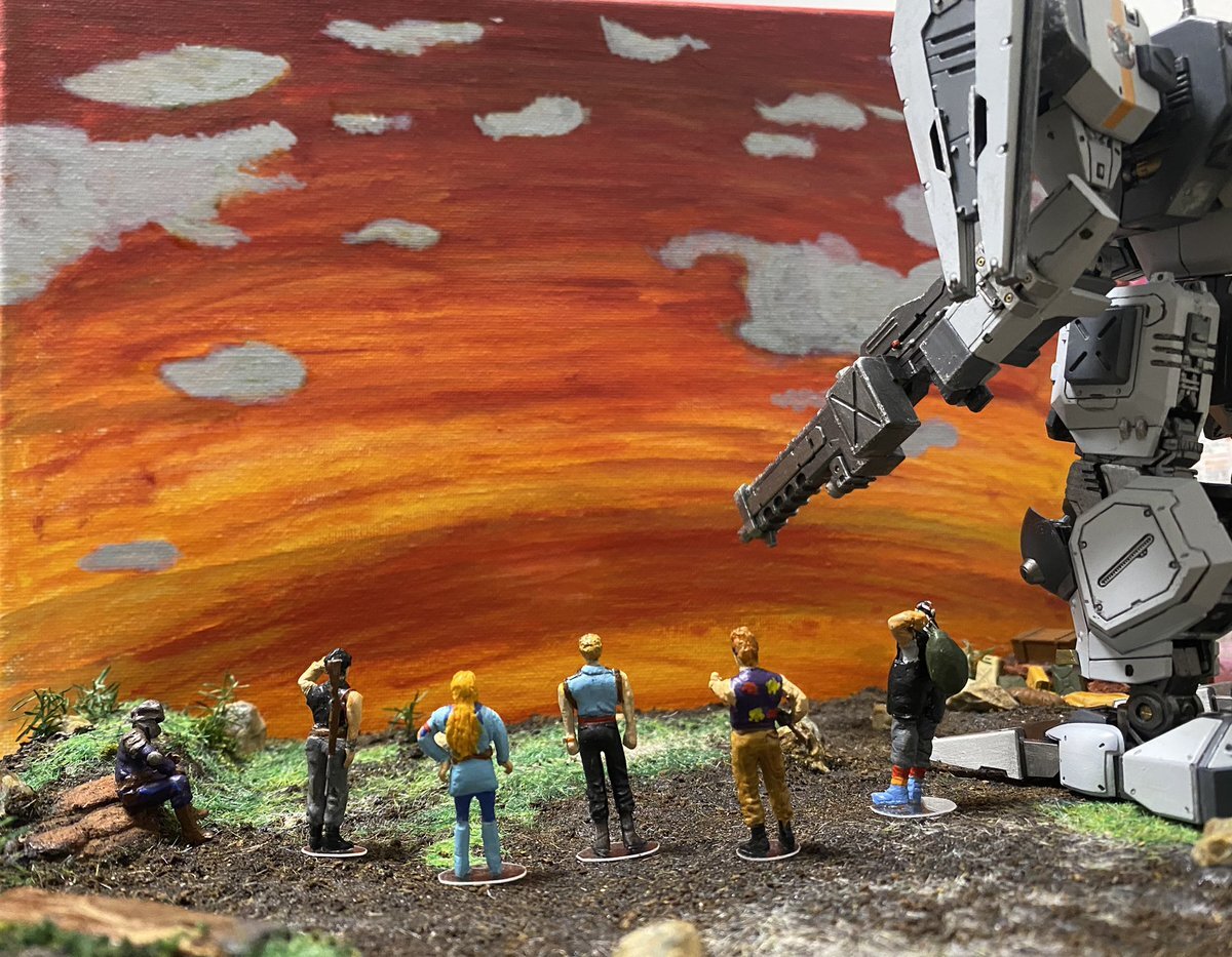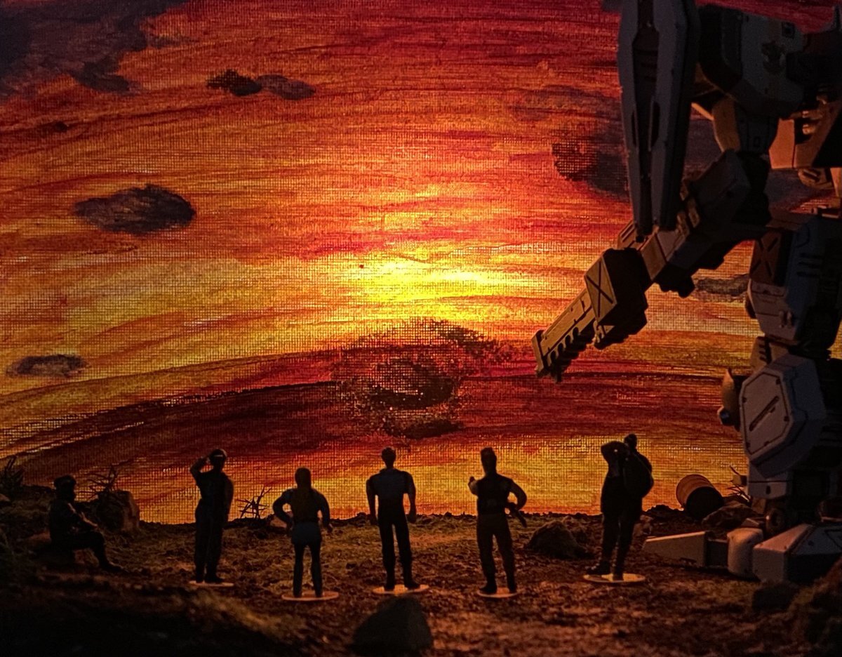 #フロントミッション #ストラクチャーアーツ #原作の隣に自分の作品を貼る 1stのエンディング。 キャンバスのペイントミスったところは爆破したロングリバース島…でいいか。 部屋暗くして、キャンバス裏に懐中電灯少し離して当てると1枚目のような写真に。 撮影法と夕焼け空の絵の一部指導は上官。 pic.x.com/jUfT28lEK9