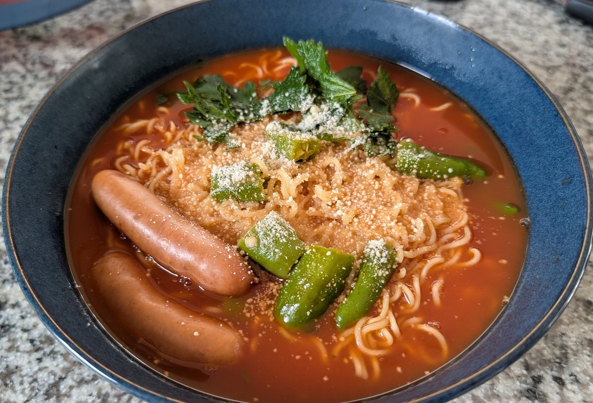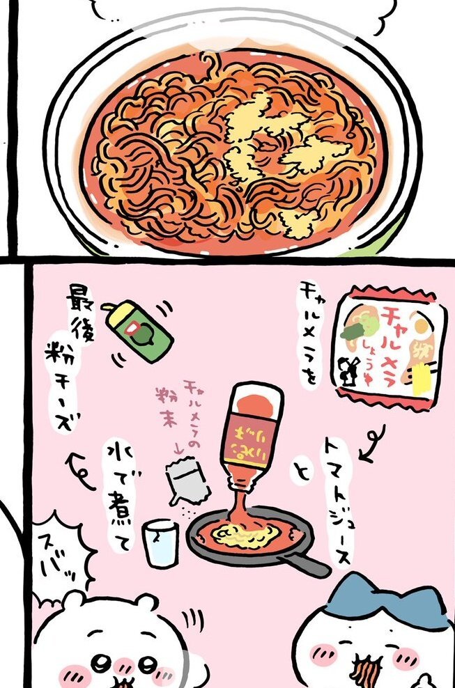 ハチワレが作ったラーメンを再現してみた。水とトマトジュースの割合が記載なかったので、3倍希釈で。奥様はそんなものが美味いハズがないとか海原雄山みたいなこと言ってたが、元々私はラーメンにトマト入れているので問題なし。 #原作の隣に自分の作品を貼る #ちいかわ pic.x.com/NzCl0fBOyh