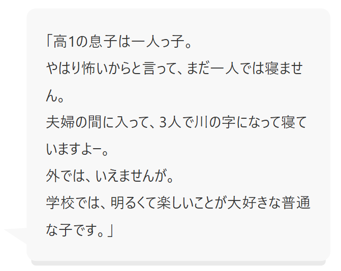 中1男子が親と一緒に寝るのはアリ? 「一人で寝るのは怖い」という理由で、男の子が母や姉と一緒の部屋で寝ている状態。 意外とこのようなお子さんは多いようですが、皆さんのご家庭ではいかがですか? #子育て #反抗期 pic.x.com/jYZyR6gSnR