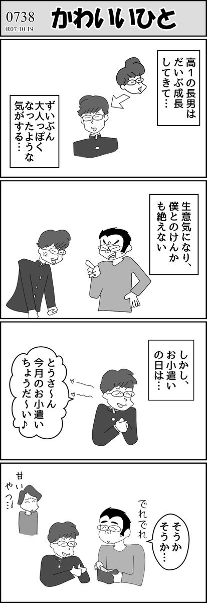 高1長男はずいぶん大人っぽくなってきました。 そうは言っても甘えられると、ついつい目じりが下がってしまいます。uchinoko3.hatenablog.com/entry/2025/10/… #漫画が読めるハッシュタグ #オリジナル漫画 #コミックエッセイ #子育て漫画 #子育て日記 #四コマ漫画 #うちの子3兄弟 #長男 #反抗期 #お小遣い pic.x.com/cU2IbycX75