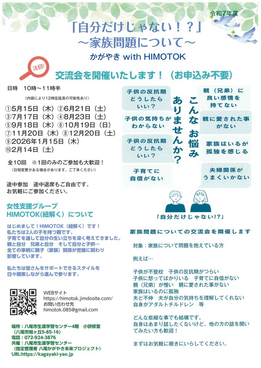 10月19日(日)開催 「自分だけじゃない⁉」~ 家族問題 について~ かがやきwith #HIMOTOK 交流会 時間:10時~11時30分 会場:八尾市生涯学習センター4階 小研修室(3) 途中参加・途中退席自由、予約不要 #八尾市生涯学習センターかがやき #八尾市 #アダルトチルドレン #シングルマザー #不登校 #反抗期 pic.x.com/mm5xuelIk2