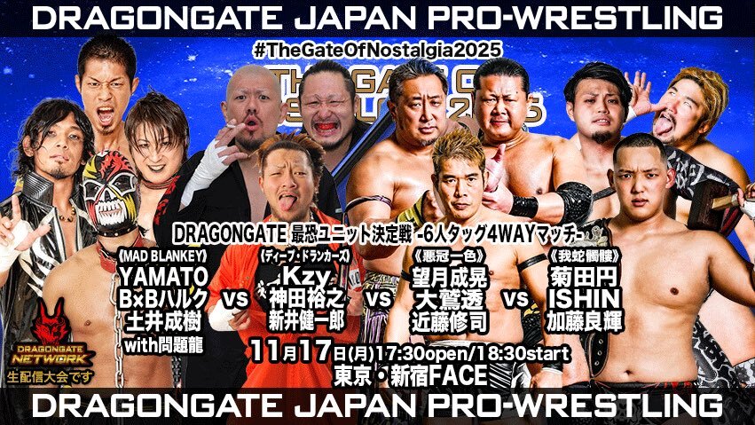 【11/17 #新宿 大会試合結果速報】 ■DRAGONGATE最怖ユニット決定戦 6人タッグ4WAYマッチ 2本目 《#MADBLANKEY#YAMATO ⭕️ #BxBハルク #土井成樹 with #問題龍 vs 《#悪冠一色#望月成晃 ✖️ #近藤修司 #大鷲透 (11分20秒: 体固め ) #DRAGONGATE #ProWrestling #TheGateOfNostalgia2025 pic.x.com/kDVjdBYqwk