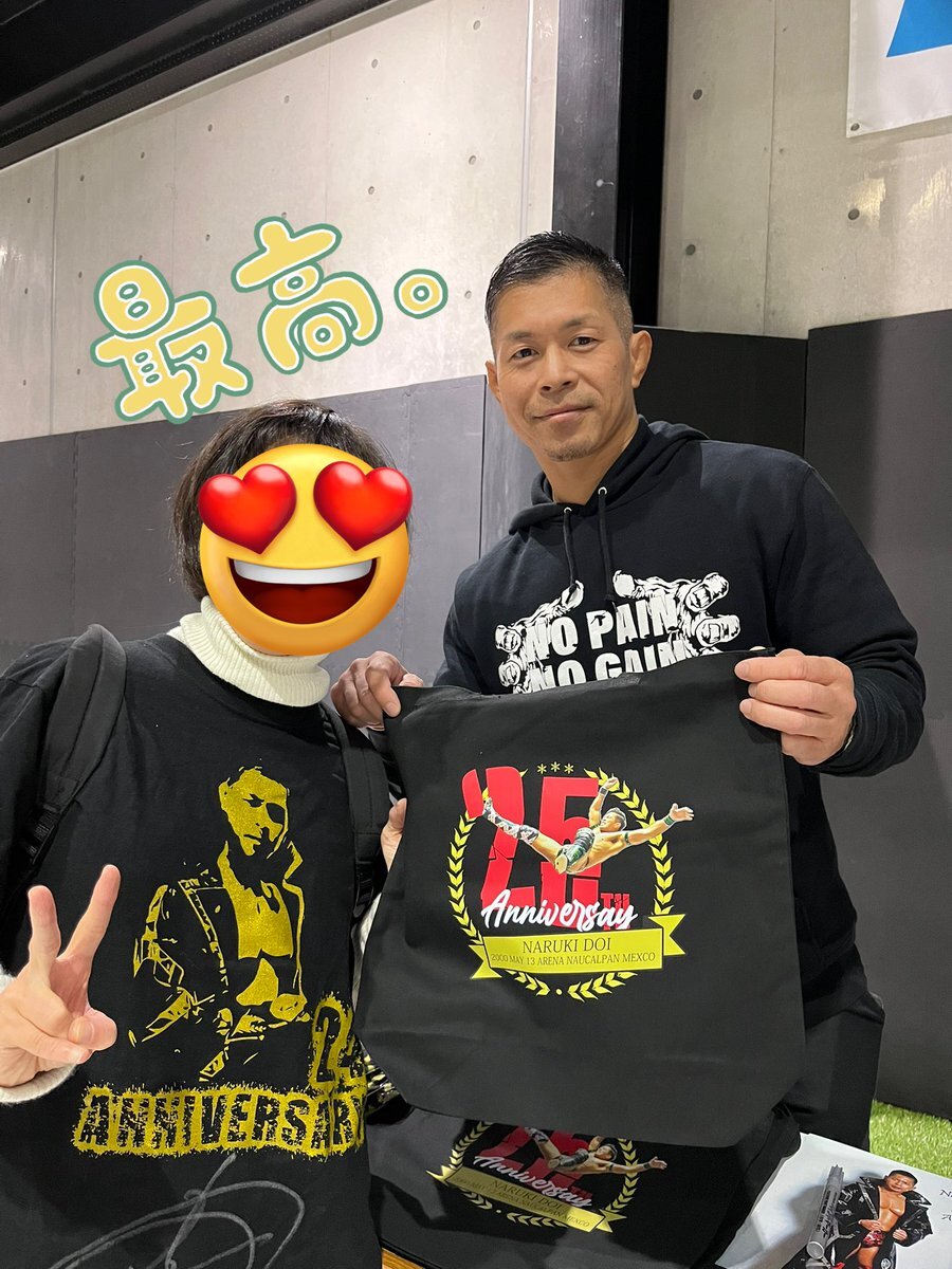 土井ちゃん25周年のトートバッグ買おうとしたら3つありますって言われて勘違いして「さすがに全部は持てないです💦」って言ったら「いや、どれにしますか?」ってめっちゃ冷静に言われちゃった。 土井ちゃんごめんなさい💦 その後も優しく会話してくれました☺ #ajpw #土井成樹