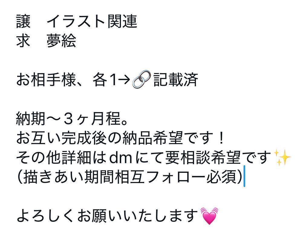 @1 求 : 夢絵 / コテ同・ハンドメイド類・シート類 譲 : イラスト類 詳細ALT #描き合い募集 #作品交換 #夢絵描き合い pic.x.com/d7vzR5kSqF