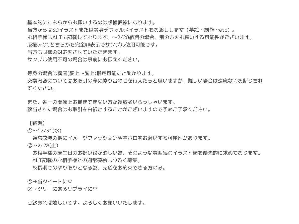 @xxx 【求】イラスト類(夢絵関連) 【譲】画像のようなイラスト類 年内/年明け納期のもの、それぞれ募集しております。 詳細は添付画像を一読願います^ᴗ.ᴗ^➰💌 いいねでお声がけいたします~❕🌷 ゆっくり巡回します💧 #描き合い募集 #夢絵描き合い pic.x.com/bWtHxw5qAz