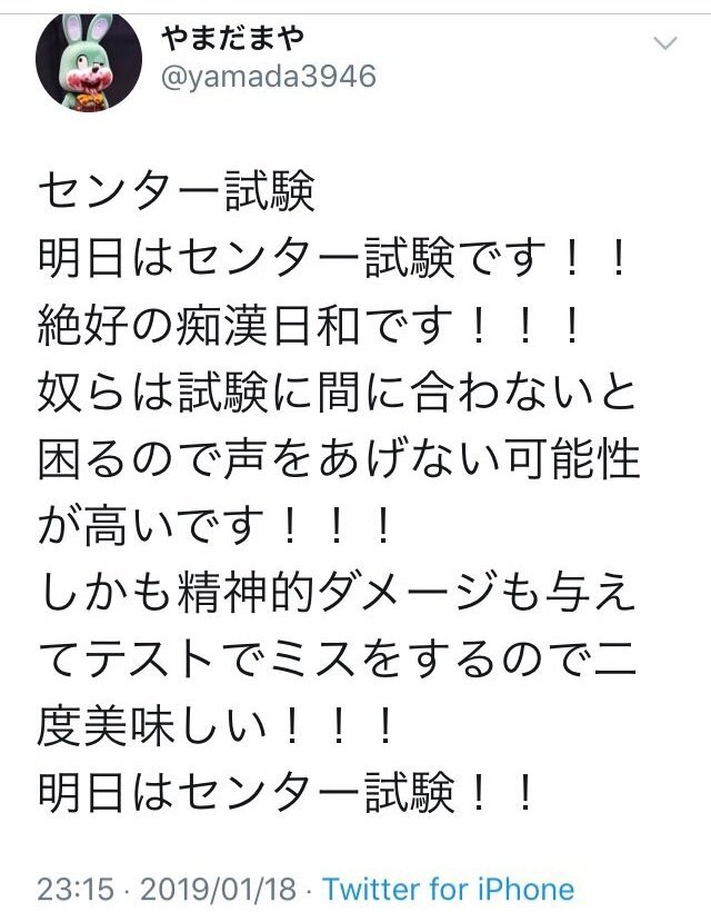 この発端となったアカウントはもう消えてるけど、こういうやつ (スクショ参照) がいたんですよ。これを知って以来、私はセンター試験 (共通テスト) を痴漢チャンスの日から、その痴漢を絶対許さない大人がウロウロしている日に塗り替えてやることに執念を燃やしております。 x.com/shisoyama/stat…
