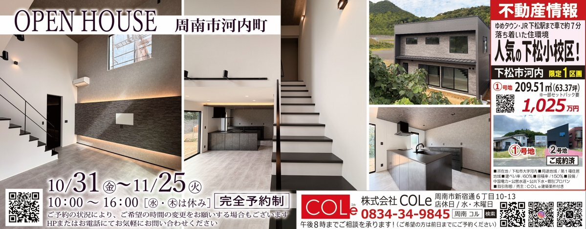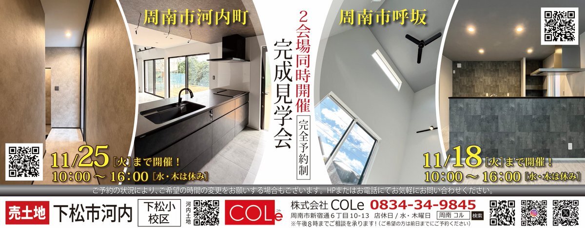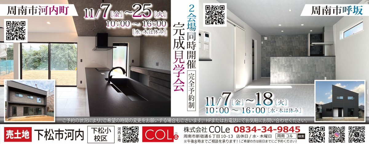 【2棟同時開催!完成見学会】 周南市河内町にて完成見学会開催中! 11月7日~周南市呼坂でも2棟同時開催致します! 周南市河内町: coleie.com/open_houses/de… 周南市呼坂: coleie.com/open_houses/de… お気軽にお問い合わせ下さい。 #完成見学会 #注文住宅 #デザイン住宅 #山口県 #周南市 #下松市 #COLe pic.x.com/GPl4gC3e3F