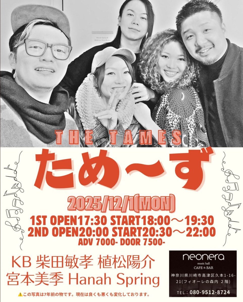 うぉー‼️‼️‼️‼️‼️ ためーずの予約開始きたぁー🎊🎊🎊 今年も大好きな5人に会える嬉しさったらない🎄😭❤️ 懐かしい写真だね🥹✨✨ #柴田敏孝 #植松陽介 #KB #宮本美季 #hanahspring musichall-neonera.com/event/ pic.x.com/Uo18zYb8k9