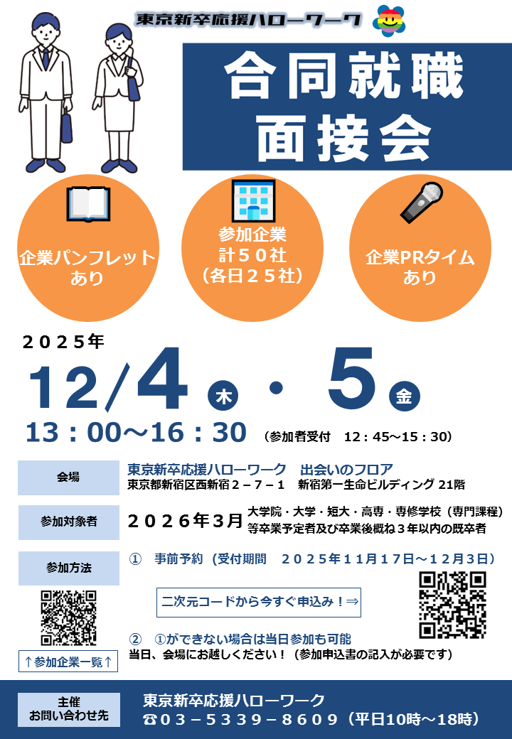🌱東京新卒応援ハローワーク合同就職面接会開催🌱 👔日時 12月4日・5日 13時〜(受付は12時45分〜) 🏢会場 東京新卒応援ハローワーク 参加企業をチェックして今すぐ事前予約しよう👇 当日参加も可能です🌸 #26卒 #新卒採用 #大学生と繋がりたい #就活生 jsite.mhlw.go.jp/tokyo-hellowor…