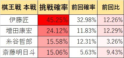 #棋王戦 本戦 ベスト4 確率分析 #伊藤匠 叡王が挑戦確率トップ。 他3名も十分挑戦がありえる確率です。 棋王戦 準決勝 斎藤明-伊藤匠,糸谷-増田康 ここからは2敗失格制。 優勝者と、残る3名で行われる 敗者復活戦の勝ち上がり者での 変則二番勝負となります。 (優勝者に1勝のアドバンテージあり) pic.x.com/sAqqdLTAYo