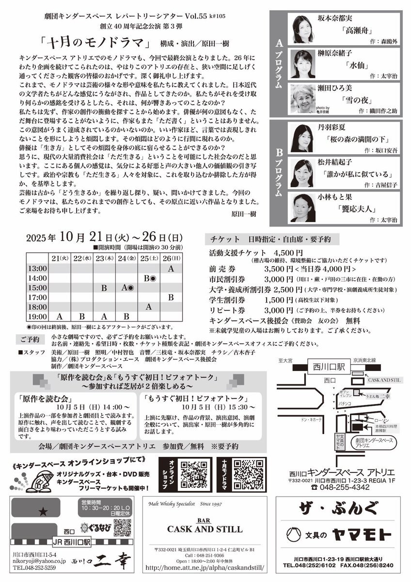 本日25日18時Aプログラム キャンセルでました! お問い合わせください! 電話でしたら 048-255-4342 にお願いします🙇 創立40周年記念公演 第三弾  「十月のモノドラマ」 構成・演出 原田一樹 #十月のモノドラマ #モノドラマ #西川口アトリエ #原田一樹 #瀬田ひろ美 #榊原奈緒子 #坂本奈都実 pic.x.com/EpMBEzh5hd