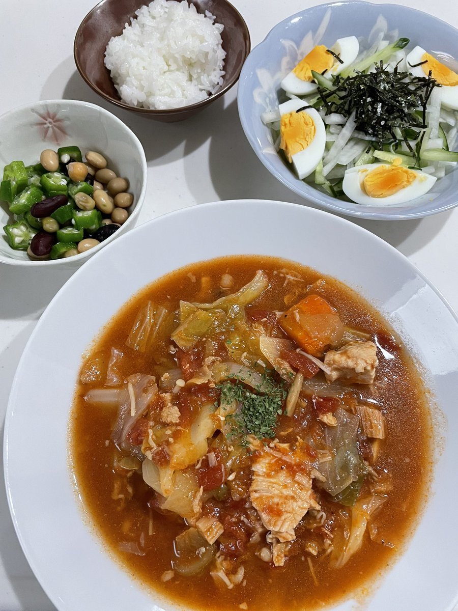 トマトスープ 大根きゅうり卵サラダ 豆オクラ和え 関西遠征で食べ過ぎたのでスープを😳 しばらく食べます💦 ご馳走様でした🙏 #おうちごはん #晩ご飯 #料理 #地味ごはん #映えないごはん #毎日のごはん pic.x.com/U7fdE1LWIE