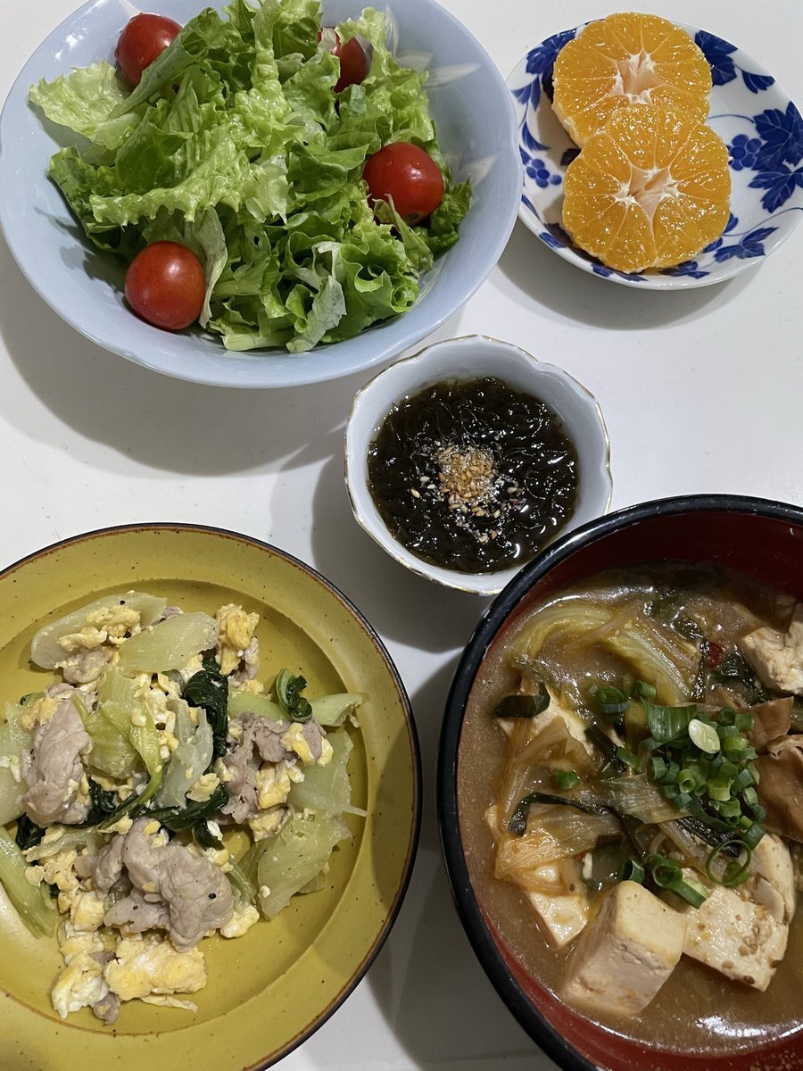 チンゲン菜豚肉卵炒め もずく モツ鍋残り サラダ みかん チンゲン菜が安くて🙌 モツ鍋残りは豆腐を足しました☺️ ご馳走様でした🙏 #おうちごはん #晩ご飯 #料理 #地味ごはん #映えないごはん #毎日のごはん pic.x.com/nnF1Hv2Es5