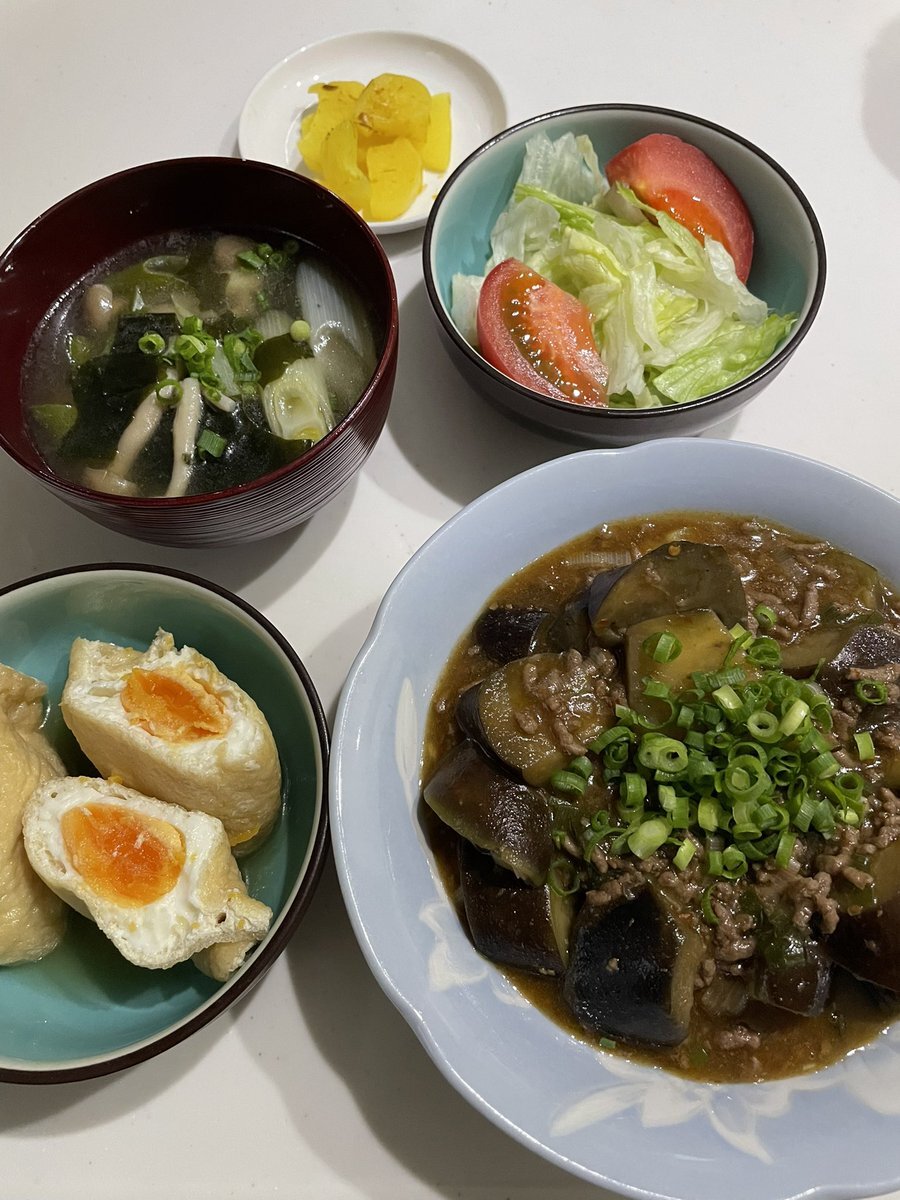 麻婆茄子 卵巾着煮 わかめきのこネギ中華スープ サラダ たくあん 茄子が安かったので久しぶりに麻婆茄子を作りました☺️豆板醤たっぷり ご馳走様でした🙏 #おうちごはん #晩ご飯 #料理 #地味ごはん #映えないごはん #毎日のごはん pic.x.com/0BKBIb9Gow