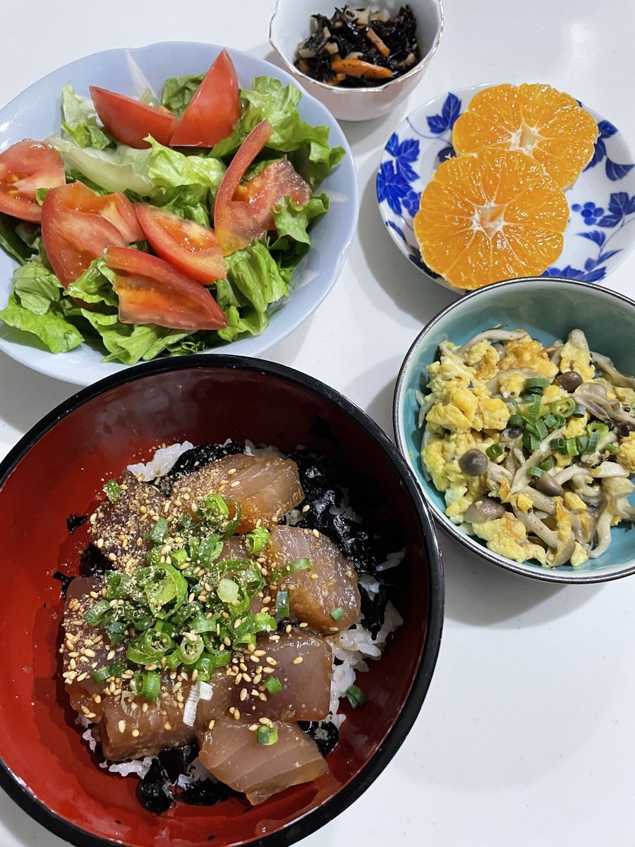 マグロ漬け丼 きのこ卵炒め ひじき煮物か サラダ みかん 今日はびんちょうマグロが安かったので漬けどんにしました☺️ 何だかまた暑い⁈😅 ご馳走様でした🙏 #おうちごはん #晩ご飯 #料理 #地味ごはん #映えないごはん #毎日のごはん pic.x.com/BU7Gds9CPO