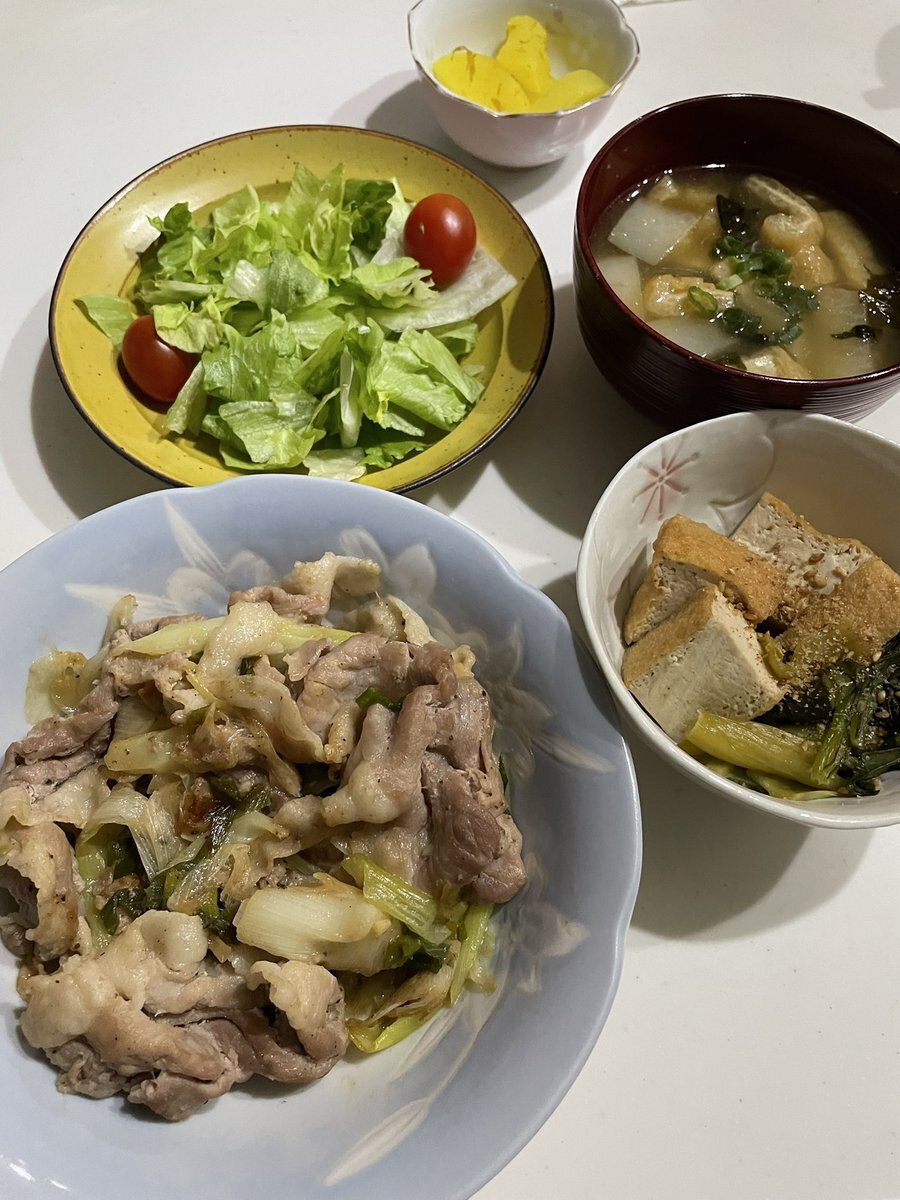 豚肉とネギの塩炒め 小松菜と厚揚げの煮物 サラダ わかめ大根油揚げの味噌汁 漬物 ネギが安いので豚肉と炒めましたー☺️ 寒いですね💦 ご馳走様でした🙏 #おうちごはん #晩ご飯 #料理 #地味ごはん #映えないごはん #毎日のごはん pic.x.com/T7pKtfm98J