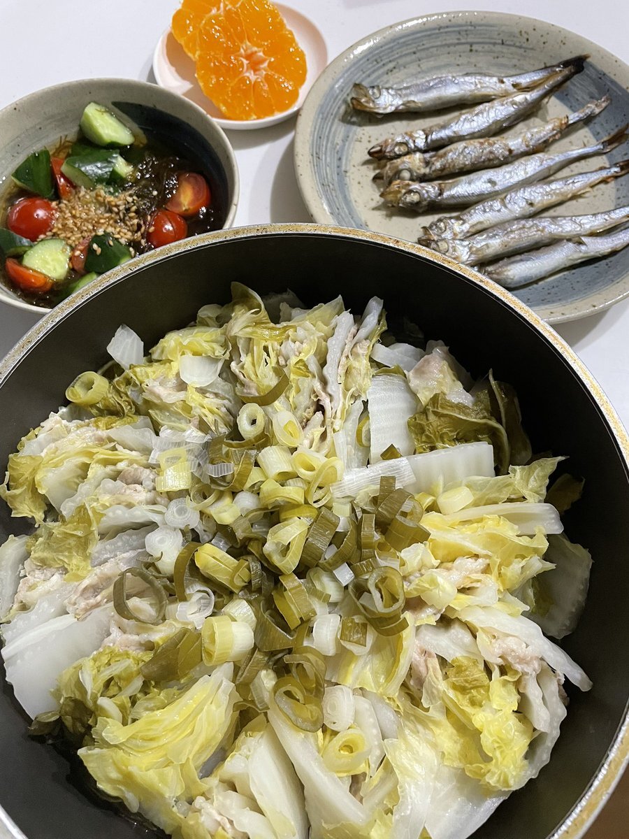 白菜豚バラミルフィーユ煮 ししゃも きゅうりトマトのもずく和え みかん 白菜がめちゃ安なので娘の好きな白菜メニューを作りました☺️ #おうちごはん #晩ご飯 #料理 #地味ごはん #映えないごはん #毎日のごはん pic.x.com/5BAkVLAcjb