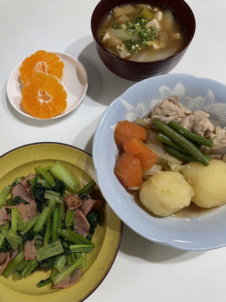 鶏肉じゃが 小松菜ベーコン炒め ネギ油揚げ豆腐味噌汁 みかん 今日は鶏肉じゃがにしました☺️ 小松菜はいつも安くてありがたい🙌 ご馳走様でした🙏 #おうちごはん #晩ご飯 #料理 #地味ごはん #映えないごはん #毎日のごはん pic.x.com/kzOe3rr03w