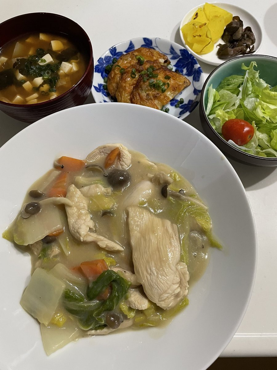 白菜鶏胸肉のうま煮 焼きさつま揚げ 味噌汁(昨日の残り) サラダ 漬物 白菜が安くて嬉しいですね☺️ 鶏胸肉も安かったのでうま煮にしてみました✨ ご馳走様でした🙏 #おうちごはん #晩ご飯 #料理 #地味ごはん #映えないごはん #毎日のごはん pic.x.com/DgOUz25bKU