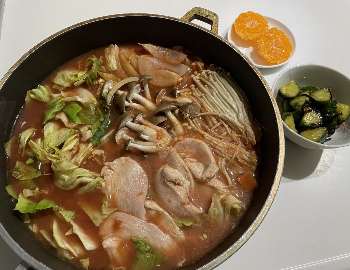 トマト鍋 きゅうり塩昆布和え みかん 今日はトマト鍋を作りました☺️ 家族で鍋好きなんですよね〜 ご馳走様でした🙏 #おうちごはん #晩ご飯 #料理 #地味ごはん #映えないごはん #毎日のごはん pic.x.com/A4r0VLV9dk