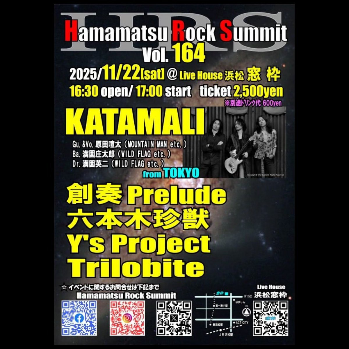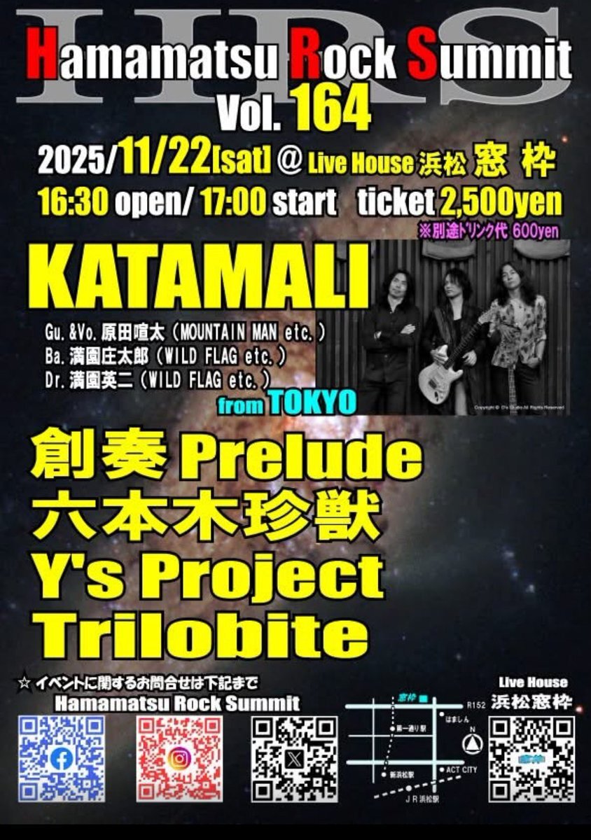 明日11/22(土)は、Hamamatsu Rock Summit vol.164です! ( ´ ▽ ` )ノ ゲストは『 KATAMALI 』 (#^.^#) 地元浜松からも素晴らしいバンドが出演します。 皆様のお越しをお待ちしています! #原田喧太 #満園庄太郎 #満園英二 #KATAMALI #創奏Prelude #六本木珍獣 #ysproject #Trilobite #浜松窓枠 pic.x.com/WZQnwhN8xq