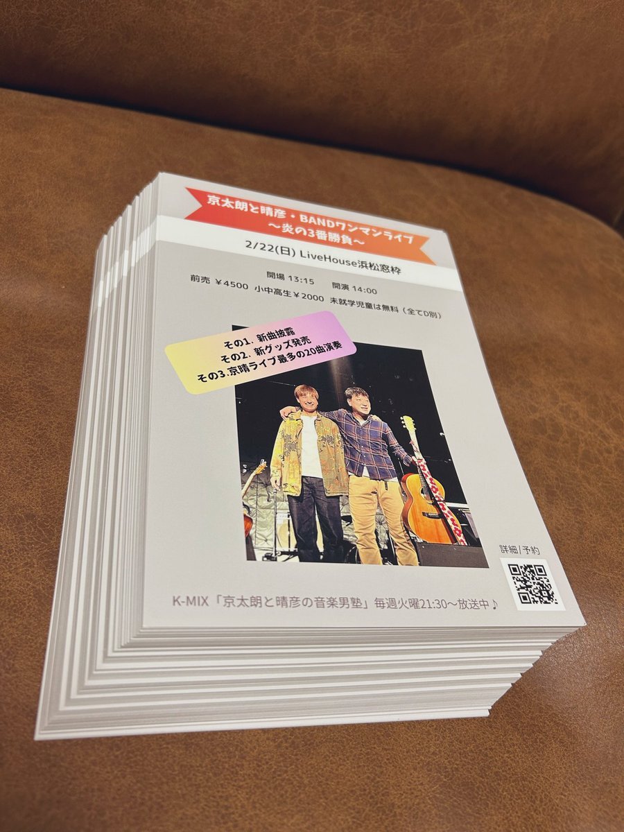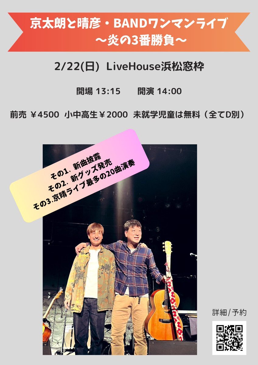 ✨京太朗と晴彦BANDワンマン2026決定✨ 2/22(日) #浜松窓枠 \\ 特別企画‼️炎の3本勝負// 🔥その① この日までに新曲作成・披露🔥 🔥その② 気分アゲアゲ新グッズ発売🔥 🔥その③ 京晴ライブ最多の20曲演奏🔥 11/22(土) TIGETにて予約受付開始✍️ pic.x.com/JmCW5Ap74z