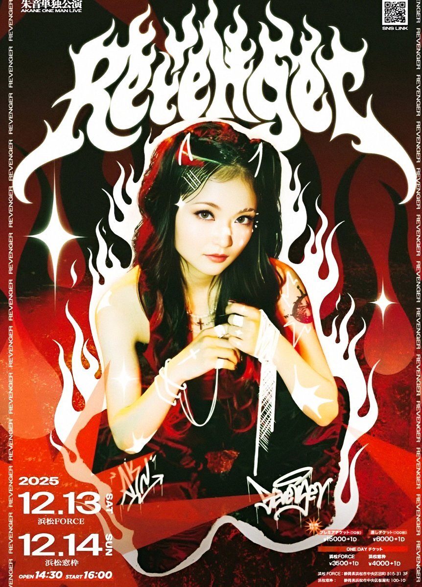 ⋱初2DAYS ワンマンライブ開催⋰ 朱音単独公演 Revenger  ̄ ̄ ̄ ̄ ̄ ̄ ̄ ̄ ̄ ̄ ̄ ̄ ̄ 🗓️ 2025.12.13 sat / 12.14 sun OPEN 14:30 / START 16:00 DAY1📍浜松FORCE @force_qm DAY2📍浜松窓枠 @Aw_one_kikaku 🎫プレミアチケット: 特典付き 『10枚』 ¥15000 🎫2DAYS 通しチケット