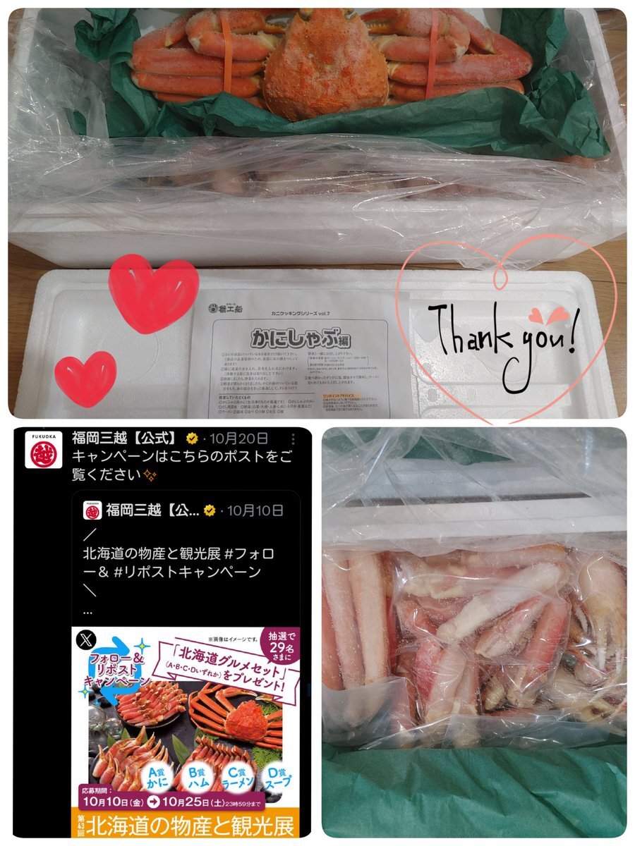 福岡三越様より☆北海道の物産展フォロー&リポストキャンペーンにて、なっなんと❕蟹当選😍💕💕💕蟹一杯に、蟹アシも沢✴️✴️✴️山💛贅沢過ぎて感動😭本当にありがとうございました❤️ #福岡三越 #当選報告 pic.x.com/G4gE2YFjT0