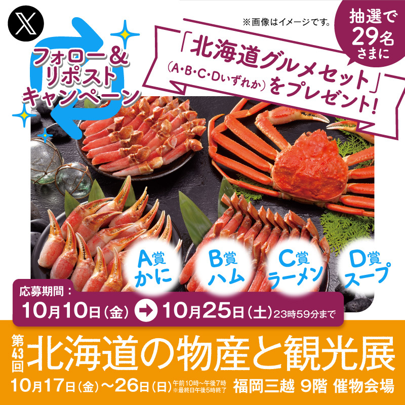 / 北海道の物産と観光展 #フォロー& #リポストキャンペーン \ 抽選で29名さまに「北海道グルメセット」(A・B・C・Dいずれか)をプレゼント🎁 ■応募方法 [1]@f_mitsukoshiをフォロー [2]このポストをリポスト (10月26日(土)23時59分まで) 詳しくはこちら iwataya-mitsukoshi.mistore.jp/mitsukoshi/eve… #福岡三越 pic.x.com/Y5TZmsGUyW