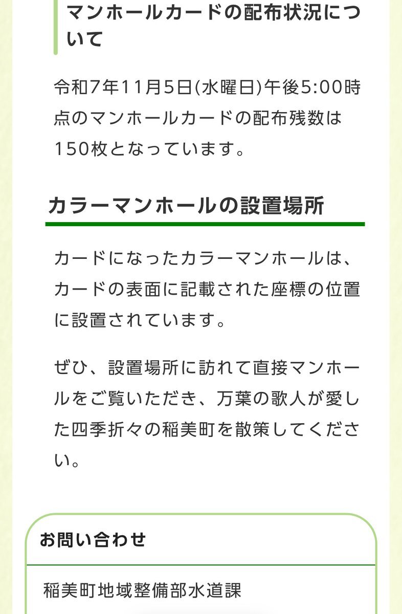 残り僅かにつき、明日以降いなみ文化の森での配布は休止するようです。2ヶ所配布は本日のみですね。 #マンホールカード #稲美町 マンホールカードを配布します | 稲美町ホームページ share.google/0gRoa4DUopu0Qx…