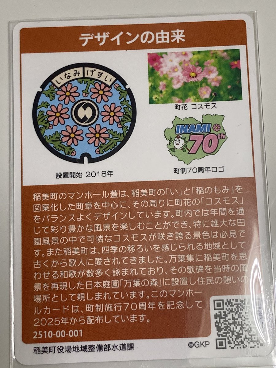 今日は役場でゲット😃 作成ロットは1ロット2000枚で、予算が残ってれば増刷するかも?との事(増刷意欲は感じられず)! でも、平日は2ヶ所配布やからすぐに枯れそう💧 ちなみに、役場配布分も2510-00-001 #マンホールカード #稲美町 pic.x.com/NiY7pEUqxu