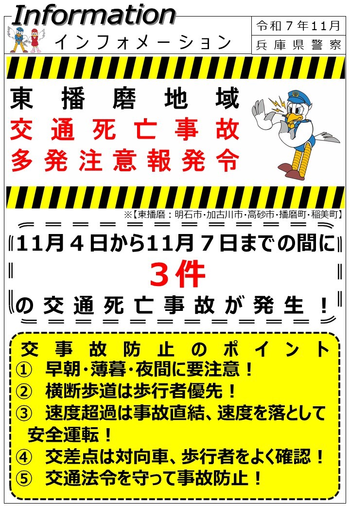 #交通死亡事故多発注意報の発令 交通企画課】 東播磨地域(#明石市#加古川市#高砂市#播磨町#稲美町)に交通死亡事故多発注意報が発令されました(11/11~11/20)。年末にかけて交通死亡事故が増加する傾向がありますので、「交通事故を起こさない」「交通事故に遭わない」ようにしましょう。 pic.x.com/3PKkPZuhy6