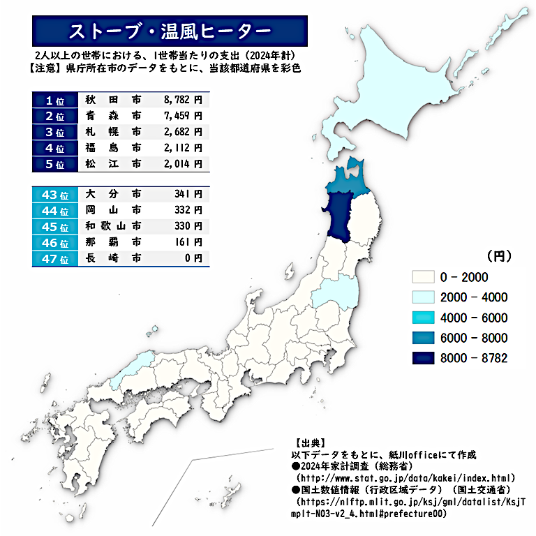 ‘ 正解は・・・ <ストーブ・温風ヒーター> 前年に続き、秋田市がトップ!! 東北の色が濃い。 寒さがうかがえますね。 今日もたくさんのリプをありがとうございます。 良い夜を! ★ファミマビジョンで出題中★ gate-one.co.jp/news/info/8326/ #ストーブ #ヒーター #地理 #GIS #クイズ #統計 pic.x.com/MWEPOLZ8yJ