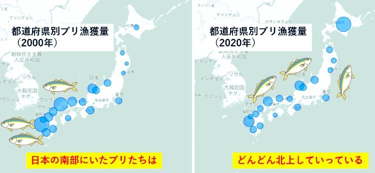 この20年でブリが獲れる場所が急激に北上している。 e-Stat(総務省統計局)のデータを元にブリが20年前と比較してどのように北上しているのかを可視化してみた。 なお、日本は地球温暖化の影響を特に強く受ける気候ホットスポットであることに注意されたい。 #統計 #地球温暖化 pic.x.com/HLLdXqlwtV